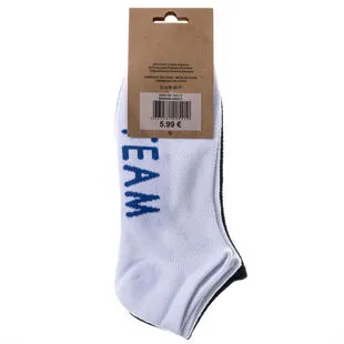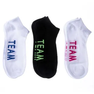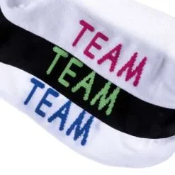 La maille de ces chaussettes courtes pour femme se compose à 49% de coton, à 29% de polyester et à 2% d’élasthanne. Elles arborent le lettrage « team » (signifiant « équipe ») sur fond blanc et noir dans un style graphique et moderne très sympa.
