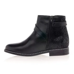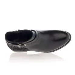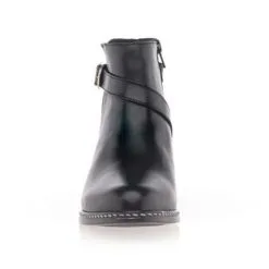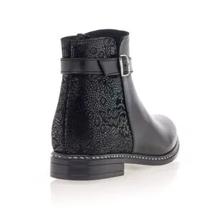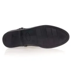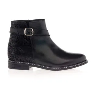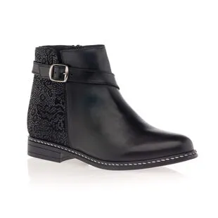 Ces boots noires à fermeture zippée sont agrémentées d’une sangle avec boucle à ardillon argentée. Leur beau cuir est contrasté en texture à l’arrière du pied par un motif stylisé ton sur ton. Un modèle écoresponsable, certifié par le groupement international LWG pour une filière cuir juste et durable !