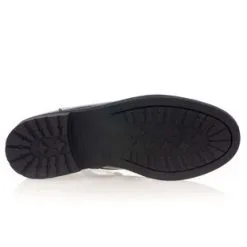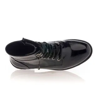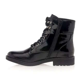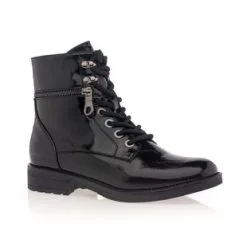 Ces bottines noires vernies au chaussant confortable disposent d’une fermeture éclair latérale décorative autour de la cheville. Leur style tendance et graphique pourrait être très sympa à associer, par exemple, à un pantalon à taille haute, un top uni, une veste oversize et un sac seau.