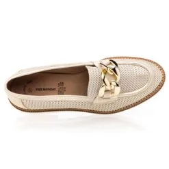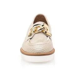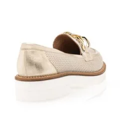 Ces mocassins dorés à chaînette brillante reposent sur une très confortable semelle de marche à talon bloc. Leur matière principale bénéficie de la certification du Leather Working Group, un collectif international œuvrant à réduire de manière drastique les impacts de la filière cuir sur l’environnement. La mode telle qu’on l’aime !