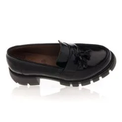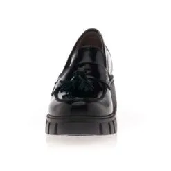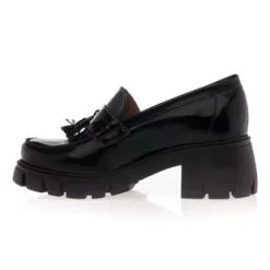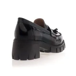 Ces mocassins en cuir noir verni (originaire du Portugal) sont agrémentés de jolies pampilles ton sur ton et reposent sur une semelle track épaisse de 6 cm. L’alliance de leurs lignes classiques et de leur base au volume original en fait une pièce mode tout simplement irrésistible !