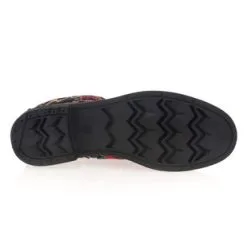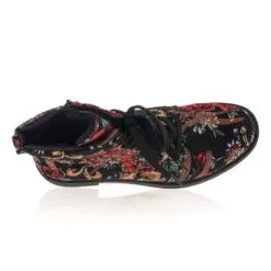 Ces bottines à lacets sont parées d’un décor stylisé fleuri multicolore sur fond noir. Leur cachet vintage pourrait être joliment intégré à une tenue par exemple composée d’une longue jupe unie, d’une tunique, d’une veste en velours toute douce et d’un sac en cuir bordeaux ou camel.