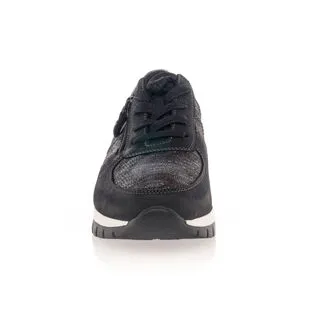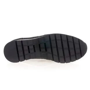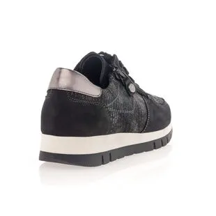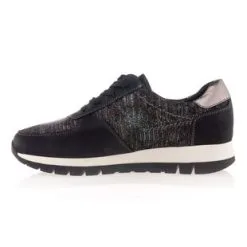 Rythmées d’un motif graphique brillant et montées sur une semelle crantée bicolore, ces baskets en cuir noir séduiront instantanément les amoureuses d’une mode urbaine stylée et confortable ! On craque pour la touche argentée de leur col de cheville et pour la fermeture zippée qui accompagne leur laçage.