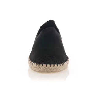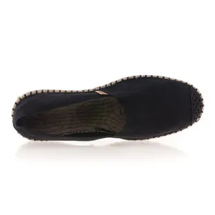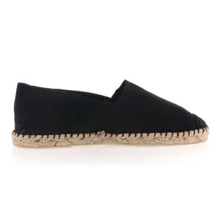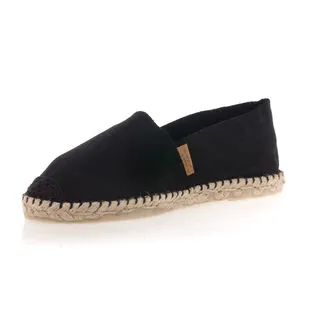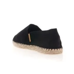Ces espadrilles noires à la semelle semi vulcanisée sont composées de coton pour leur toile, de jute pour leur corde et de caoutchouc pour leur gomme. Le pied droit et le pied gauche ne sont pas déterminés, c’est avec l’usage que ces chaussures d’été prendront leur forme.
