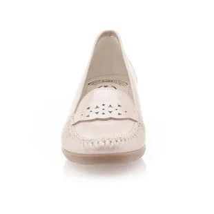 Ces mocassins compensés en cuir beige de belle qualité présentent un très confortable talon haut de 4 cm. Leur style élégant serait par exemple très harmonieux pour accompagner une robe évasée, un gilet fin et un sac classique aux anses arrondies. Un modèle de fabrication française.