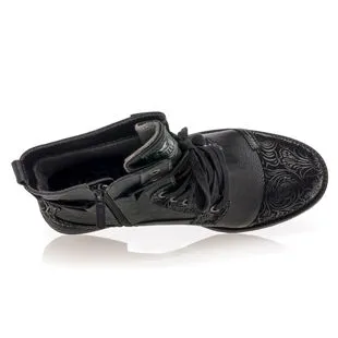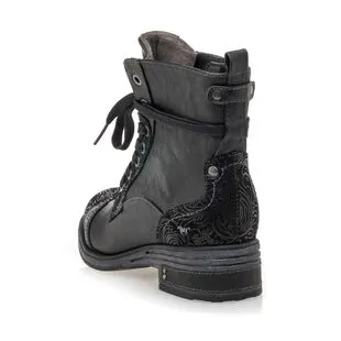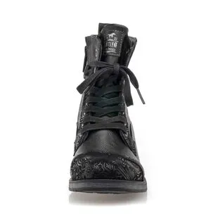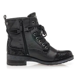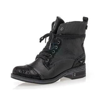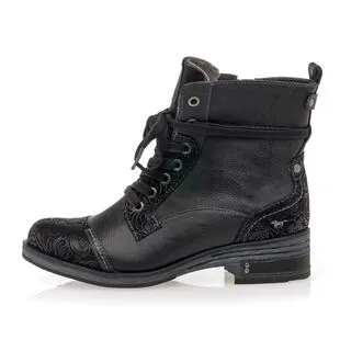 Ces bottines noires Mustang sont renforcées à leurs extrémités par des empiècements au motif stylisé. On les voit bien utilisées pour accompagner, par exemple, un jean délavé à la coupe droite, une chemise en flanelle unie ou à gros carreaux écossais et un sac en cuir patiné.