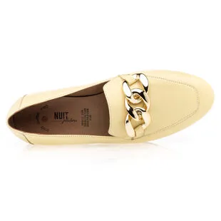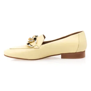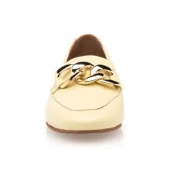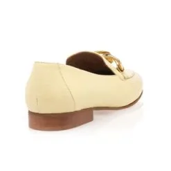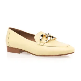 Ces magnifiques mocassins en cuir jaune arborent une chaînette dorée brillante sur le bout du pied. On aime leur style élégant, aux accents délicieusement vintages. Et si on les associait par exemple à un pantalon à taille haute, une chemisette satinée à manches courtes et un sac rétro ?