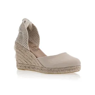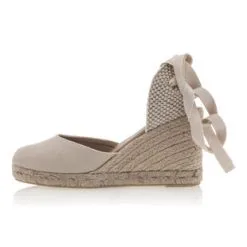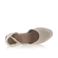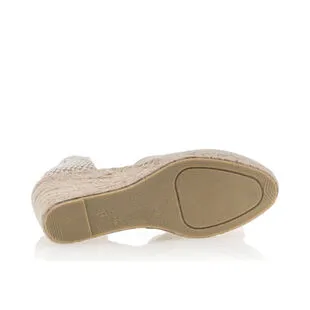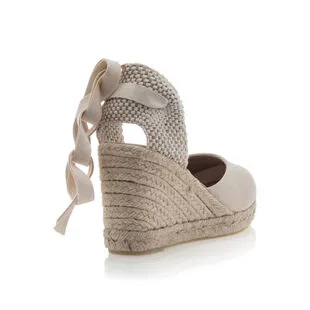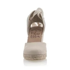 On se chausse dans un style particulièrement agréable grâce à cette paire de sandales espadrilles beiges au talon compensé en corde tressée haut de 8 cm. Dans l’idéal, ce modèle sera plus adapté à une tenue courte ou mi-longue afin de laisser apparaître son joli laçage ruban autour de la cheville.