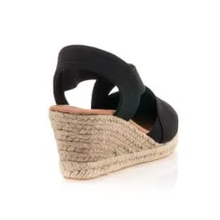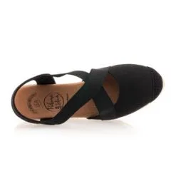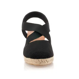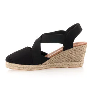 Ces sandales espadrilles en toile noire reposent sur une semelle compensée en corde tressée au talon haut de 6 cm. Elles sont renforcées à leur bout par un empiècement brodé et disposent de larges bandeaux élastiqués sur le cou-de-pied. Un modèle agréable à porter et facile à assortir.
