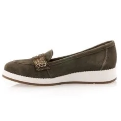 Ces mocassins en cuir velours kaki (certifié LWG pour son mode de fabrication écologique) reposent sur une petite semelle compensée blanche épaisse de 3 cm. Leur empeigne arbore une bande transversale au motif brillant contrastant. Aussi stylé que confortable, ce modèle a tout d’un nouveau basique !