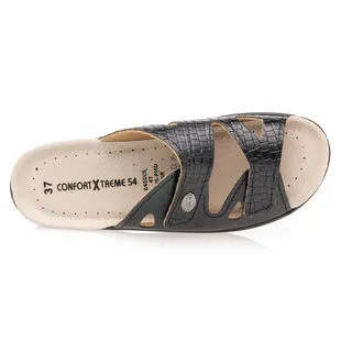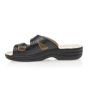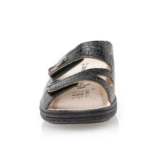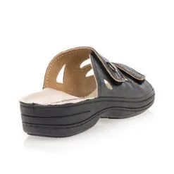 Ces chaussures confort en cuir noir s’ajusteront parfaitement à la forme naturelle du cou-de-pied grâce à leurs deux points d’attache velcro très pratiques. Leur semelle au talon compensé se fera quant à elle synonyme d’un parfait soutien à la voûte plantaire pendant la marche. Un accessoire précieux pour les beaux jours !