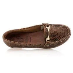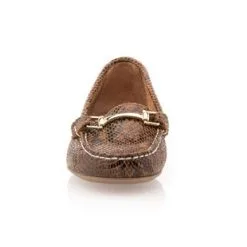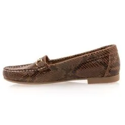 Le cuir cognac de ces mocassins classiques présente une finition écaillée façon « python ». Ces chaussures plates confortables viendront tout naturellement accompagner une tenue soignée, comme un pantalon droit et un chemisier satiné par exemple. À moins que l’on ne soit plutôt d’humeur robe boutonnée ? Laissons parler nos envies !