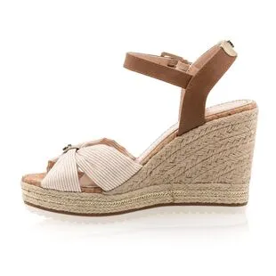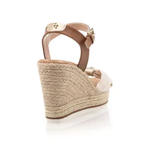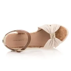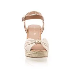 Les tenues de l’été vont être sublimées par le charme de ces sandales espadrilles beiges au talon compensé haut de 9 cm. Elles arborent deux larges brides joliment entrecroisées sur le bout du pied et se fixent au tour de cheville à l’aide d’une petite boucle à ardillon. On craque avec grand plaisir !