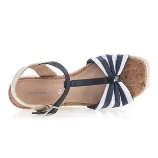 Les espadrilles compensées se présentent ici avec un talon haut de 9 cm et une bride transversale au motif marinière. Parmi les nombreuses tenues qu’elles pourraient finaliser avec charme, on peut par exemple opter pour un jean retroussé aux chevilles, un top blanc sans manches et un sac en raphia.
