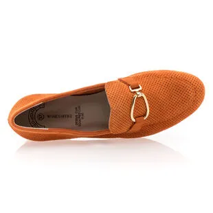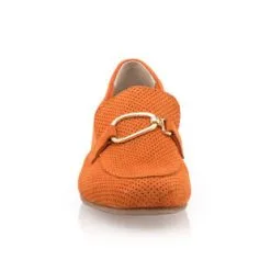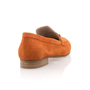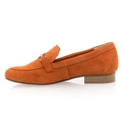 La nuance orangée de ces mocassins en cuir velours (certifié LWG) à chaînette dorée leur confère un style chaleureux et plein de charme. Elle pourrait par exemple être très harmonieuse utilisée dans une tenue comportant du jaune, un bleu marine ou encore du rouge.
